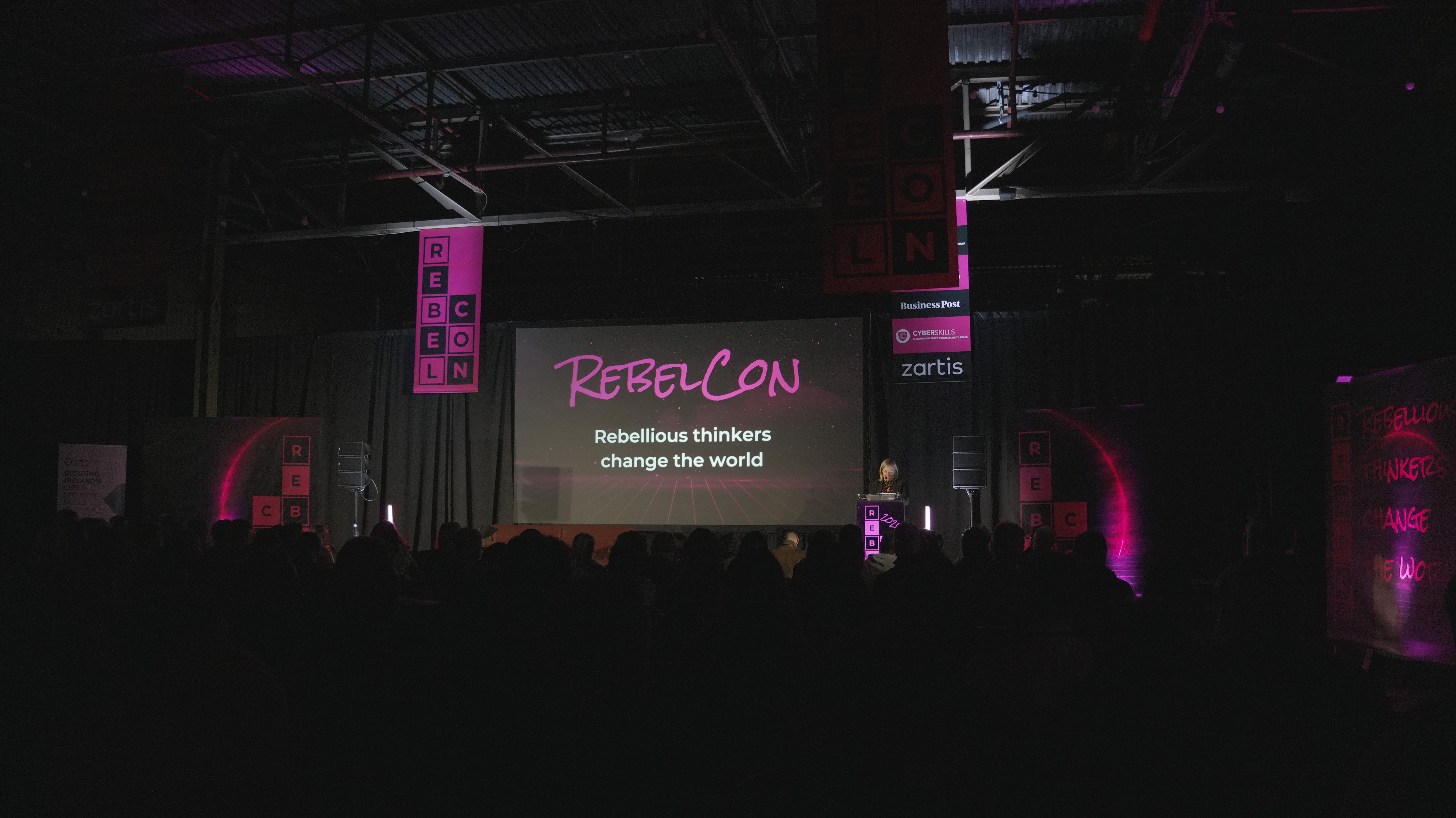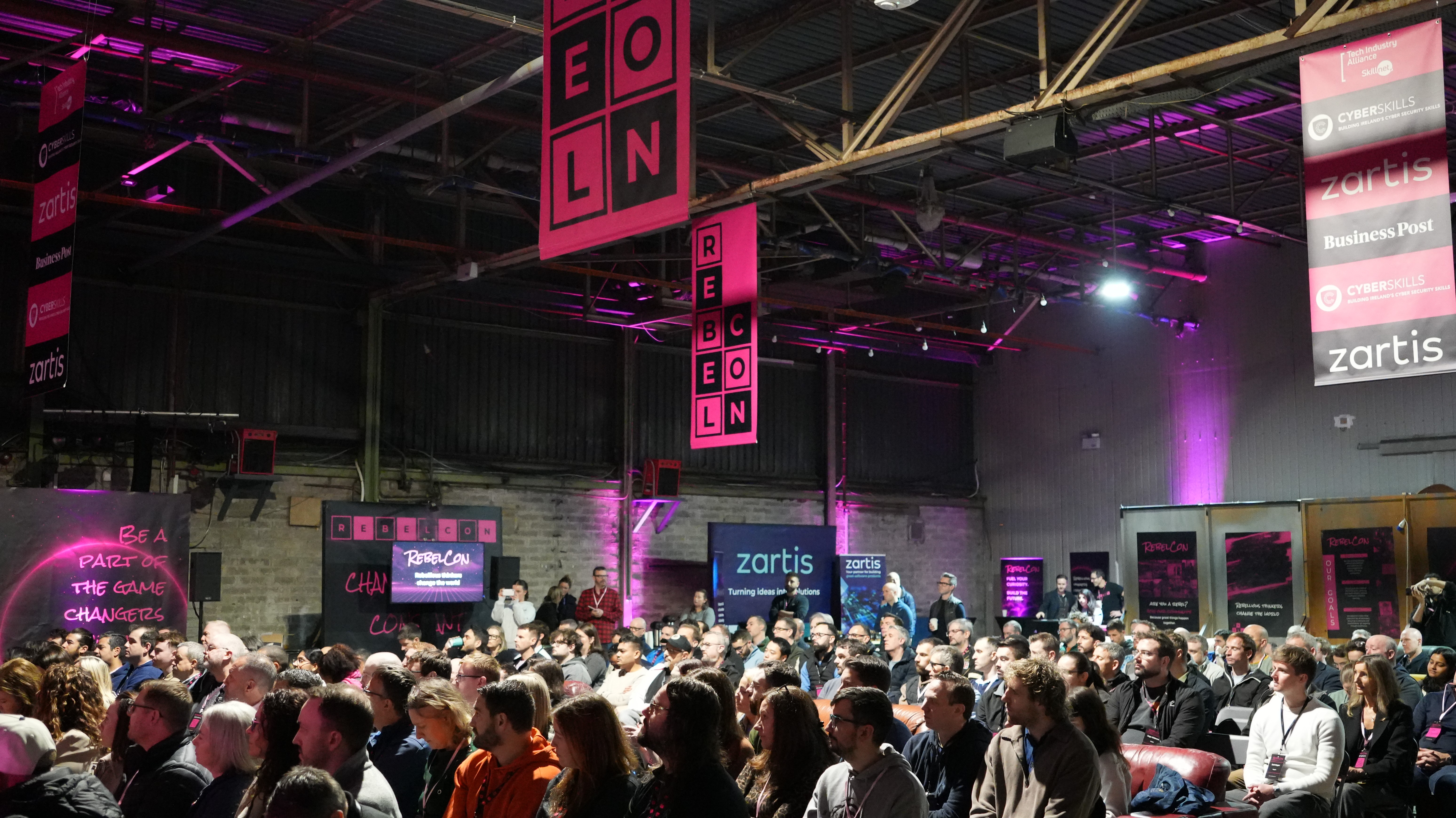 We went heavy on printed media. Rebelcon branding everywhere, playing off the industrial backdrop. Tech conference polish against raw Cork venue. The contrast worked.